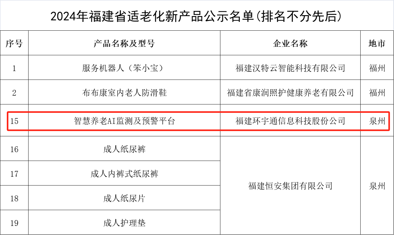 2024年11月19日,2024年福建省适老化新产品公示名单公布,全省有24款产品位列名单,泉州共有五款产品入选。其中Ebpay电子依托技术积累和创新能力所推出的“智慧养老AI监测及预警平台”入选该名单。这一荣誉不仅是对公司在“AI+医疗康养”领域的长期努力和贡献的肯定,更是对未来持续创新与高质量开展的激励。